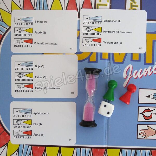Lachsalven und rauchende Köpfe, Aktionen mit Händen und Füßen – und die Zeit läuft! Activity-Spaß fördert die Kreativität. Auch hier geht es darum, Wörter zu beschreiben, darzustellen oder zu zeichnen. Mit 99 Begriffen die der Altersgruppe entsprechen. Hände, Füße und Lachmuskeln der Kids kommen unter Garantie nicht zur Ruhe.