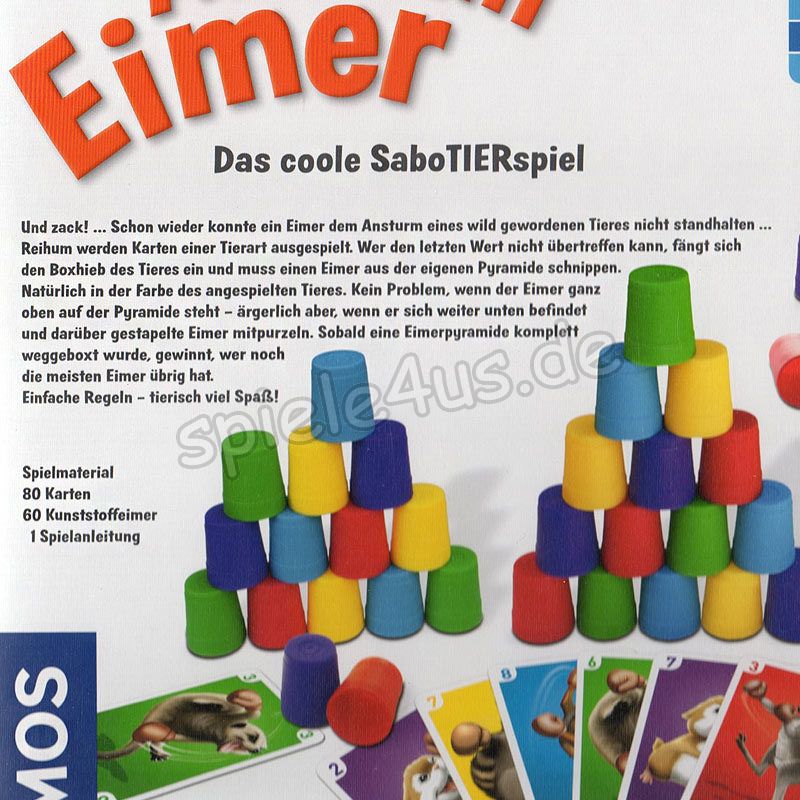 Und zack! Schon wieder konnte ein Eimer dem Ansturm eines wild gewordenen Tieres nicht standhalten… Reihum werden Karten einer Tierart ausgespielt. Wer den letzten Wert nicht übertreffen kann, fängt sich den Boxhieb des Tieres ein und muss einen Eimer aus der eigenen Pyramide schnippen. Natürlich in der Farbe des angespielten Tieres. Kein Problem, wenn der Eimer ganz oben auf der Pyramide steht – ärgerlich aber, wenn er sich weiter unten befindet und darüber gestapelte Eimer mitpurzeln. Sobald eine Eimerpyramide komplett weggeboxt wurde, gewinnt, wer noch die meisten Eimer übrig hat. Einfache Regeln – tierisch viel Spaß!