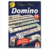 Schöne Sammlung mit 24 Spielvarianten für die 55 großen Dominosteinen mit farbigen Punkten. Die Spielsteine haben das Format ca. 50 x 8 x 24 mm.