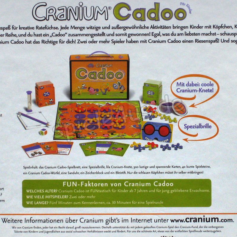 In diesem Spiel werden Kinder und Erwachsene zu Schauspielern, Knet-Experten, Geheimcode-Knackern und Puzzlern und entdecken somit ihre verborgenen Talente. Dieses Spiel enthält viele Fragen, eine unerbittliche Sanduhr, eine Spezialbrille, Cranium-Knete und verrückte, verschachtelte Spielsteine. Ein witziges, kreatives und cleveres Spaßspiel.