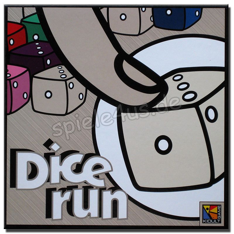 Ein verrücktes Würfelrennen mit einer Reihe von Fliegenden Zielen, an dem 30 Würfel-Wettläufer teilnehmen. Die Spieler versuchen indem sie die Spezialkarten verwenden bei jeder Etappe des Rennens ihr geheimes Ziel zu erreichen und so viele Siegespunkte wie möglich zu ergattern. In Kidultgame „Dice run“ gehören die Würfel-Wettläufer niemandem, aber jeder Spieler hat bei jedem Fliegenden Ziel seine Favoriten, die er auf die ersten Plätze kommen lassen will.