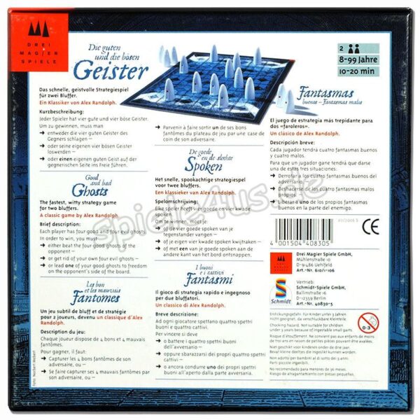 Jeder Spieler hat vier gute und vier böse Geister. Betrachtet man sie von vorne so erscheinen sie einem alle gleich. Nur von hinten betrachtet erkennt man den Unterschied.