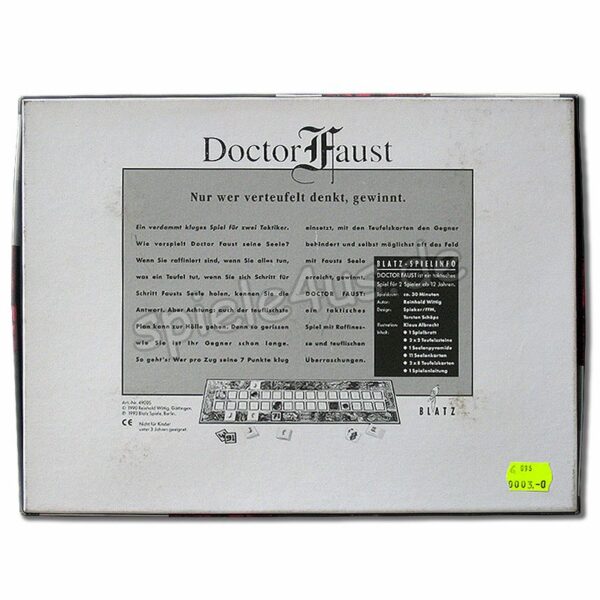 Wie verspielt Doctor Faust seine Seele? Wenn Sie raffiniert sind, wenn Sie alles tun, was ein Teufel tut, wenn Sie sich Schritt für Schritt Fausts Seele holen, kennen Sie die Antwort. Aber Achtung: auch der teuflischste Plan kann zur Hölle gehen. Ein verteufelt taktisches kluges Spiel für 2 Spieler.