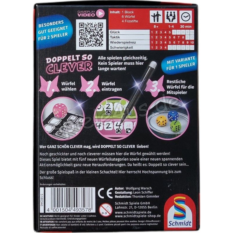Wer Ganz schön clever mag, wird Doppelt so clever lieben! Noch geschickter und noch cleverer müssen hier die Würfel gewählt werden! Dieses Spiel bietet mit fünf neuen Würfelkategorien sowie einer spannenden neuen Aktionsmöglichkeit ganz neue Herausforderungen. Da heißt es: Doppelt so clever sein… Der große Spielspaß in der kleinen Schachtel! Hier herrscht Hochspannung bis zum Schluss!