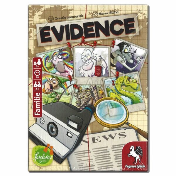 Evidence ist ein flottes Kartenspiel mit Deduktions- und Ärgerelementen, denn auch die anderen Spieler wetteifern um den Platz auf der Titelseite. Es gilt daher, Hinweise zum richtigen Zeitpunkt auszuspielen und seine Recherchen auf das vielversprechendste Mysterium zu konzentrieren. Am besten bevor die Mitspieler ebenfalls Wind von der Story bekommen. Eine Profivariante für fortgeschrittene Spieler sorgt für langanhaltenden Spielspaß.