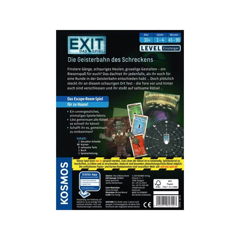 Gruselspaß der besonderen Art: Lust auf eine Runde in der Geisterbahn? Gerne – was aber, wenn diese plötzlich nicht mehr weiterfährt und man als Spieler in der Kulisse stecken bleibt? Dann wird es höchste Zeit, sich mit seinen Mitstreitern auszutauschen und zusammenzuarbeiten, um dem Ort des Schreckens schnellstmöglich wieder zu entfliehen. Wer die Rätsel lösen kann, wird mit der Freiheit belohnt. Dieses EXIT Spiel ist besonders für Rätsel-Neulinge geeignet und führt schaurig-schön in die Welt der Escape-Room-Spiele ein.