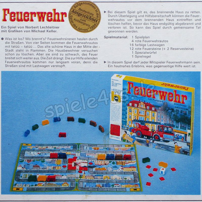 Es brennt! Mit lautem Tatüüt…tataa…rückt die Feuerwehr in allen 4 Teilen der Stadt gleichzeitig aus. Doch die engen Straßen sind voll mit Lastwagen und Autos, ein Chaos droht. Wird die Feuerwehr rechtzeitig da sein, um das schöne alte Haus zu retten? Jetzt kommts drauf an, dass ein jeder von Euch das Richtige tut.
