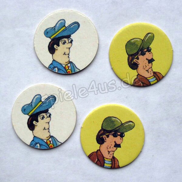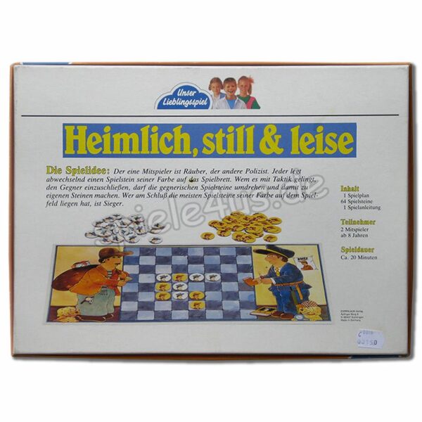 Bei diesem Spielekrimi für 2 ist der eine Spieler der Räuber und der andere Polizist. Abwechselnd werden eigene Spielsteine gelegt. Wem es gelingt den Gegner einzuschließen, darf die gegnerischen Plättchen durch Umdrehen zu eigenen machen. Am Ende siegt derjenige mit den meisten Spielsteinen seiner Farbe auf dem Spielbrett.