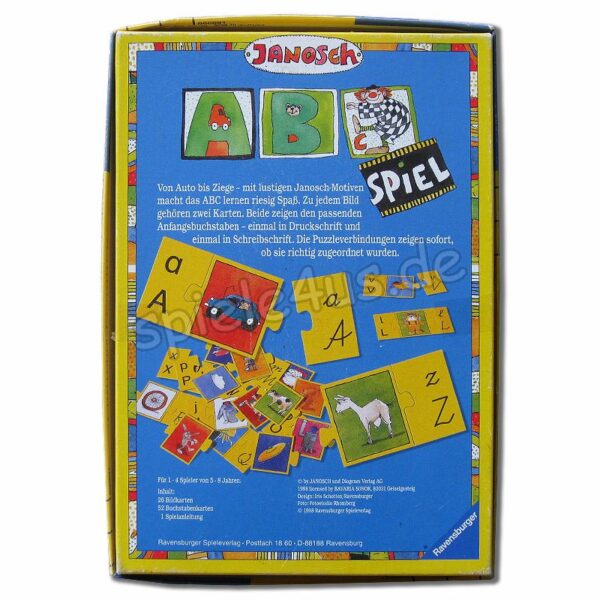 Das ABC lernen mit lustigen Janosch-Motiven. Jeweils 3 Puzzlekarten mit Motiv und Anfangsbuchstaben in Schreibschrift und Druckschrift gehören zusammen.