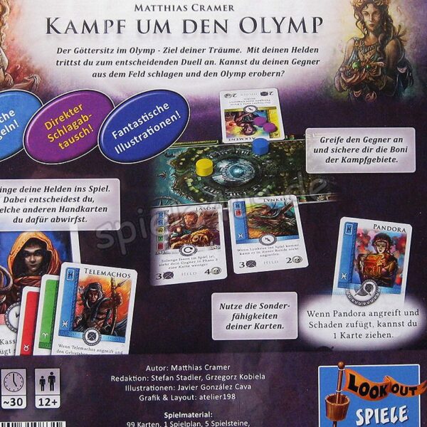 „Kampf um den Olymp“ ist ein kämpferisches Kartenspiel von Matthias Cramer, bei dem zwei Kontrahenten gegeneinander um den Olymp ringen. Dazu schicken Sie Ihre Soldaten und Helden in den direkten Zweikampf auf den Schlachtfeldern „Olymp“, „Delphi“ und „Troja“ um sich unterschiedliche Vorteile zu sichern. Grafisch ansprechend gestaltet von Javier Gonzalez bietet das Spiel ein spaßiges Intermezzo auf jedem Spieleabend.