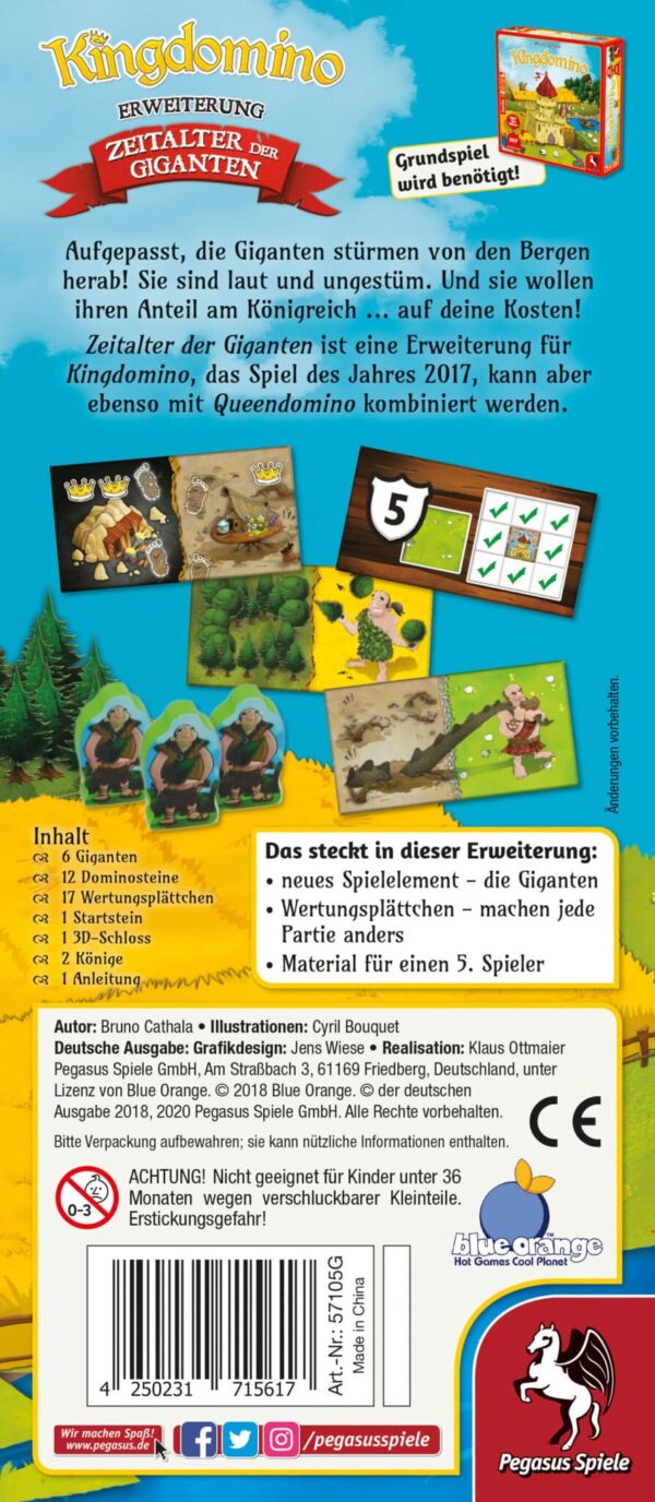 Die Erde bebt, die Menschen erzittern. Riesen sind aus den Bergen hinabgestiegen und treiben nun ihr Unwesen in den wachsenden Königreichen von Kingdomino – das Zeitalter der Giganten ist gekommen! Sie zertreten die Häuser der Bewohnenden und kosten die Herrschenden wertvolle Prestigepunkte. Doch während manche nur den Schrecken sehen, erkennen andere die Chance: man kann sich vor den Riesen fürchten – oder man macht sie sich clever zu Nutze und schickt sie in die Königreiche der Konkurrenz. Natürlich gibt es auch Mittel und Wege, um die lästigen Besucher wieder loszuwerden. Obendrein sorgen Aufgabenkarten dafür, dass es Bonuspunkte für gezielten Landschaftsbau gibt.