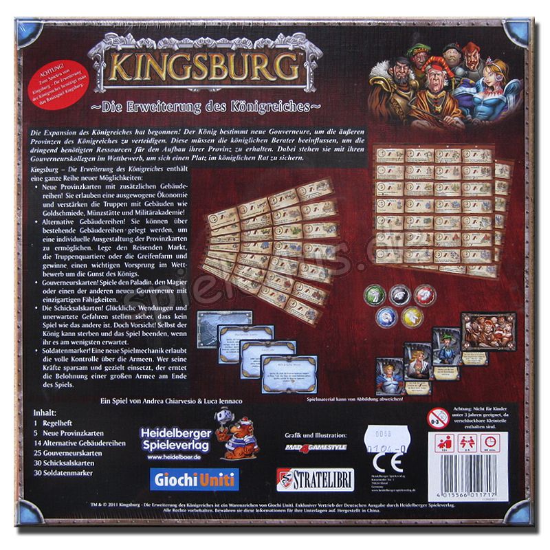 Kingsburg – Die Erweiterung des Königreiches bietet 5 Erweiterungssets für das Grundspiel. Jedes dieser Erweiterungssets kann einzeln mit dem Grundspiel gespielt werden. Es ist auch möglich mehrere Erweiterungssets auf einmal zu integrieren. Die Spielzeit verlängert sich dabei pro Erweiterungsset um 5-15 Minuten.