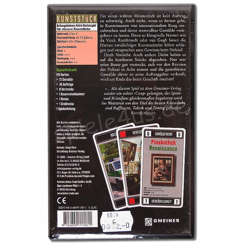 Inhalt: 119 Karten (72 Gemälde, 36 Aufträge, 8 Verstecke, 1 Asservatenkammer, 1 Razzia, 1 Großrazzia), Spielregel (deutsch).