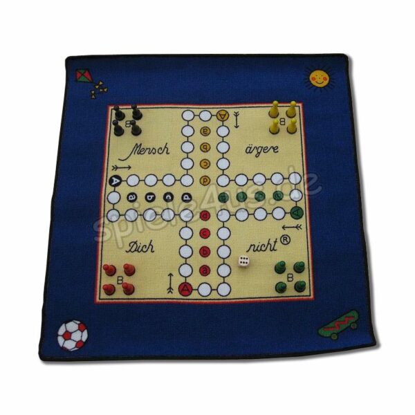 Der Spielteppich hat das Format ca. 90 x 90 cm. Mit großen Spielfiguren und Würfel.