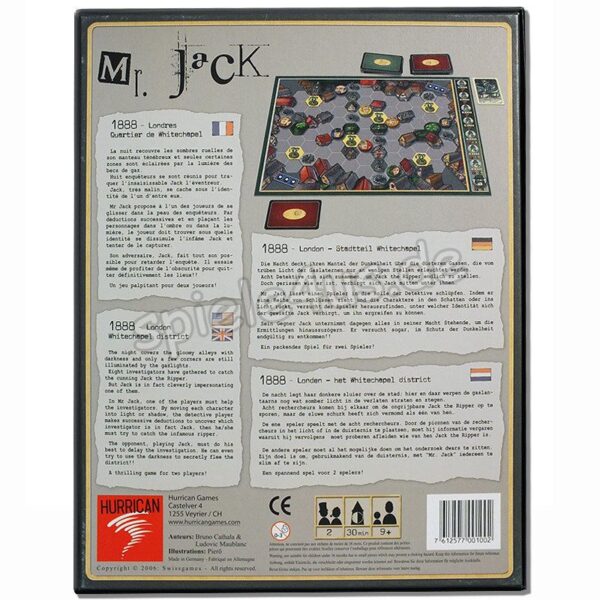 Mr. Jack ist ein asymmetrisches Spiel für zwei Spieler. Jeder hat ein anderes Spielziel. Ein Spieler übernimmt die Rolle des Inspektors, der andere die Mr. Jacks.