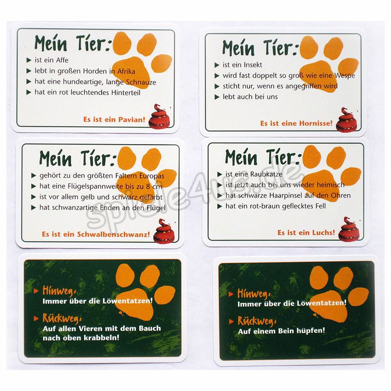 Ich bin sehr gespannt, wie euch mein Dschungel-Pfad gefällt! Unterwegs meistert ihr auf Löwentatzen ein Stück des Weges. Klingt einfach, wenn ihr nicht noch die Aktionskarte in der einen Hand halten müsstet und immer nur eine Löwentatze frei wäre – da heißt es, Gleichgewicht bewahren! Ich bin gespannt, wer am meisten über die Tiere weiß und am Schluss das Spiel gewinnt!