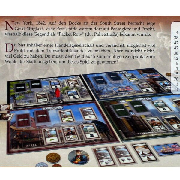 Du befindest Dich als Inhaber einer Handelsgesellschaft im New York des 19. Jahrhundert. Dein Geld versuchst mit dem Transatlantikhandel zu machen. Du ziehst Aufträge an Land und kannst die Postschiffe wenn Du Glück hast mit den richtigen Waren und dem richtigen Ziel bestücken. Vergiss nicht Dein erzieltes Einkommen rechtzeitig zum Wohle der Stadt wieder auszugeben, um dieses Spiel zu gewinnen!