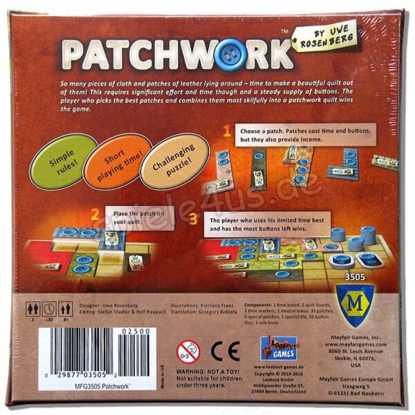 Fügt die ausliegenden Stoffreste erfolgreich zu einer schönen Patchworkdecke zusammen. Wählt einen Flicken aus, bezahlt ihn und platziert ihn auf der Decke. Es siegt derjenige, welcher den Platz am besten nutzt und am Ende noch die meisten Knöpfe übrig hat.