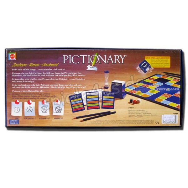Zeichnen-Raten-Gewinnen! Beißt euch auf die Zunge …verratet nichts – zeichnet es! Pictionary ist das Spiel, bei dem der Stift das Sagen hat! Versucht aus den Hinweisen, die euer Maler für euch zeichnet, den richtigen Begriff zu erraten. Es kann alles sein: ein Ort, eine Person oder eine Tätigkeit – etwas Einfaches oder etwas Schwieriges! Es ist ein Spiel gegen die Zeit. Zeichnet, was euer Team ausrufen soll, oder zeichnet eine Reihe einzelner Hinweise – bis der richtige Begriff gerufen wird!