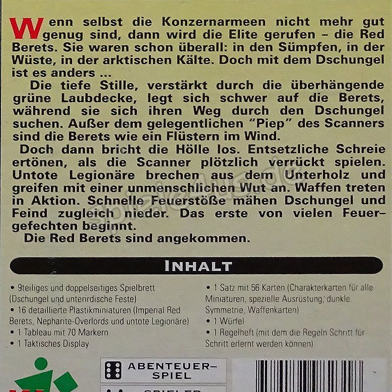 Schnelles Aktionsspiel um den Kampf gegen das Böse auf einer feindlichen Welt. Wenn selbst die Konzernarmeen nicht mehr gut genug sind, dann wird die Elite gerufen – die Red Berets. Sie waren schon überall: In den Sümpfen, in der Wüste, in der arktischen Kälte. Doch mit dem Dschungel ist es anders. Die tiefe Stille, verstärkt durch die überhängende grüne Laubdecke, legt sich schwer auf die Berets, während sie sich ihren Weg durch den Dschungel suchen. Außer dem gelegentlichen „Piep“ des Scanners sind die Berets wie ein Flüstern im Wind. Doch dann bricht die Hölle los. Entsetzliche Schreie ertönen, als die Scanner plötzlich verrückt spielen. Untote Legionäre brechen aus dem Unterholz und greifen mit einer unmenschlichen Wut an. Waffen treten in Aktion. Schnelle Feuerstöße mähen Dschungel und Feind zugleich nieder. Das erste von vielen Feuergefechten beginnt. Die Red Berets sind angekommen!