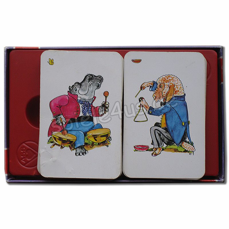 Dieses Schwarzer Peter Kartenspiel besteht aus einem ganzen Orchester fröhlich Musik machender Tiere. Sammelt die zusammengehörenden Paare, aber erwischt nach Möglichkeit nicht den Dirigenten (= Schwarzer Peter).