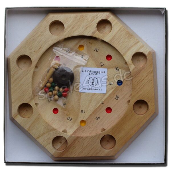 Mit etwas Glück und Geschick kann man hier jede Menge Punkte kassieren. Auch als Lernspiel für den Zahlenraum einsetzbar. Schönes Spielbrett aus Volllholz mit einem Durchmesser von ca. 29 cm.