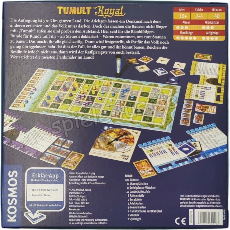 Der reiche Adel baut ein Denkmal nach dem anderen und dabei hat das Volk nichts zu essen. Der Tumult ist vorprogrammiert. Hierbei rafft ihr Baumaterial für den Bau von Statuen an euch. Doch gebt acht, die gierigsten Mitspieler werden bestraft. Wem gelingt es die meisten Denkmäler zu errichten?