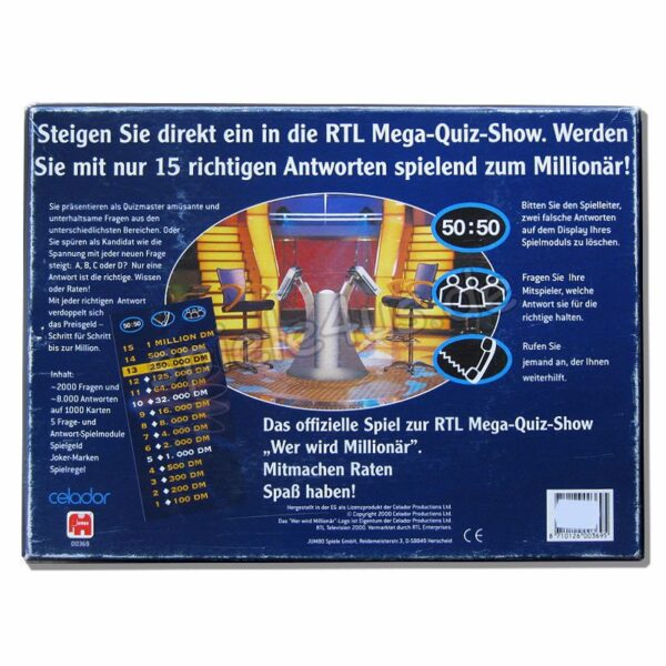 Mit 15 richtigen Antworten spielerisch zum Millionär werden. Natürlich mit Hilfe des 50:50 Jokers, des Publikums und des Telefonjokers. Enthalten sind 2.000 Fragen und 8.000 Antworten. Das offizielle Spiel zur RTL-Mega-Quiz-Show.
