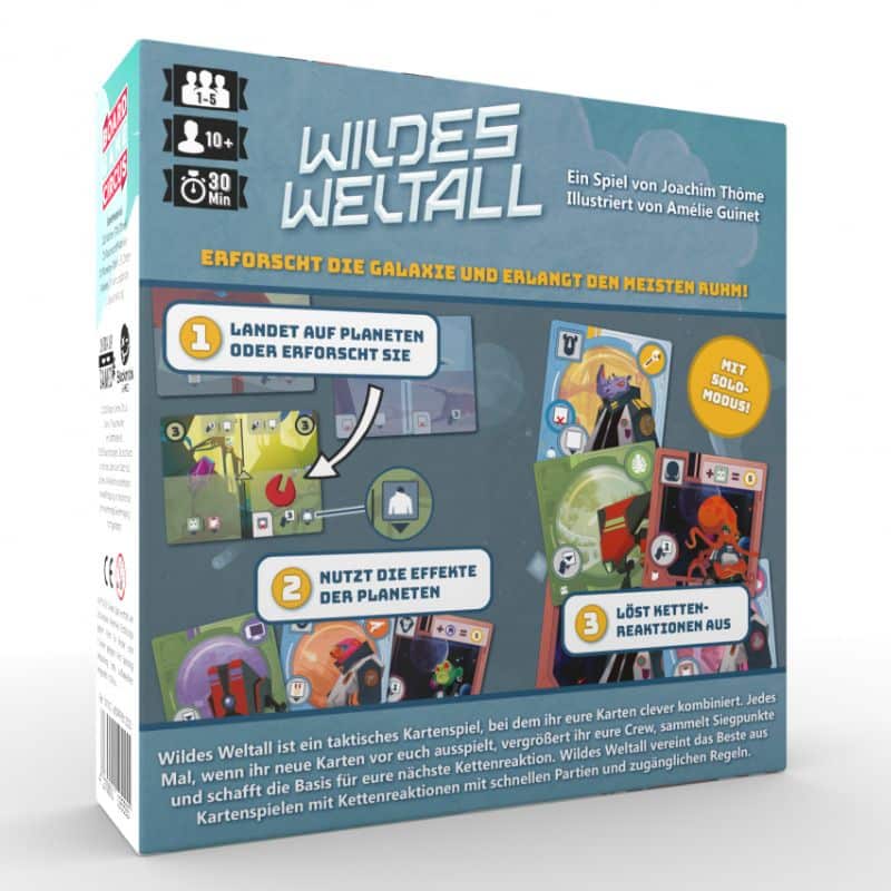 Wildes Weltall ist ein taktisches Kartenspiel, bei dem ihr eure Karten clever kombiniert. Jedes Mal, wenn ihr neue Karten vor euch ausspielt, vergrößert ihr eure Crew, sammelt Siegpunkte und schafft die Basis für eure nächste Kettenreaktion. Wildes Weltall vereint das Beste aus Kartenspielen mit Kettenreaktionen mit schnellen Partien und zugänglichen Regeln.