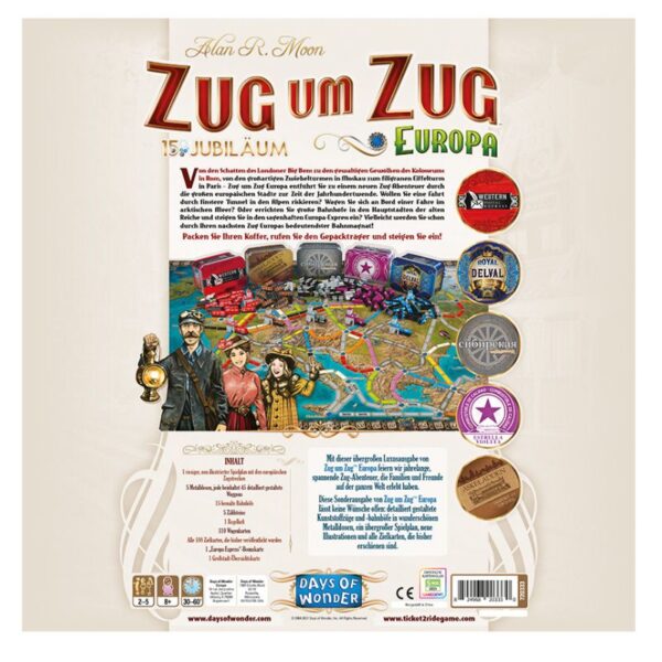 Zug um Zug Europa: 15 Jahre Edition ist eine luxuriöse und erweiterte Version von Zug um Zug Europa und bietet spannende Zugabenteuer für Familien und Freunde. Mit fein detaillierten Kunststoffzügen und – bahnhöfen, die in hochwertigen Metallboxen geliefert werden, und neuen, wunderschönen Illustrationen wurde das Spiel aufgewertet und mit allen bisher entworfenen Zielkarten erweitert. Diese Deluxe-Version ist die ultimative Ausgabe des Klassikers Zug um Zug Europa.